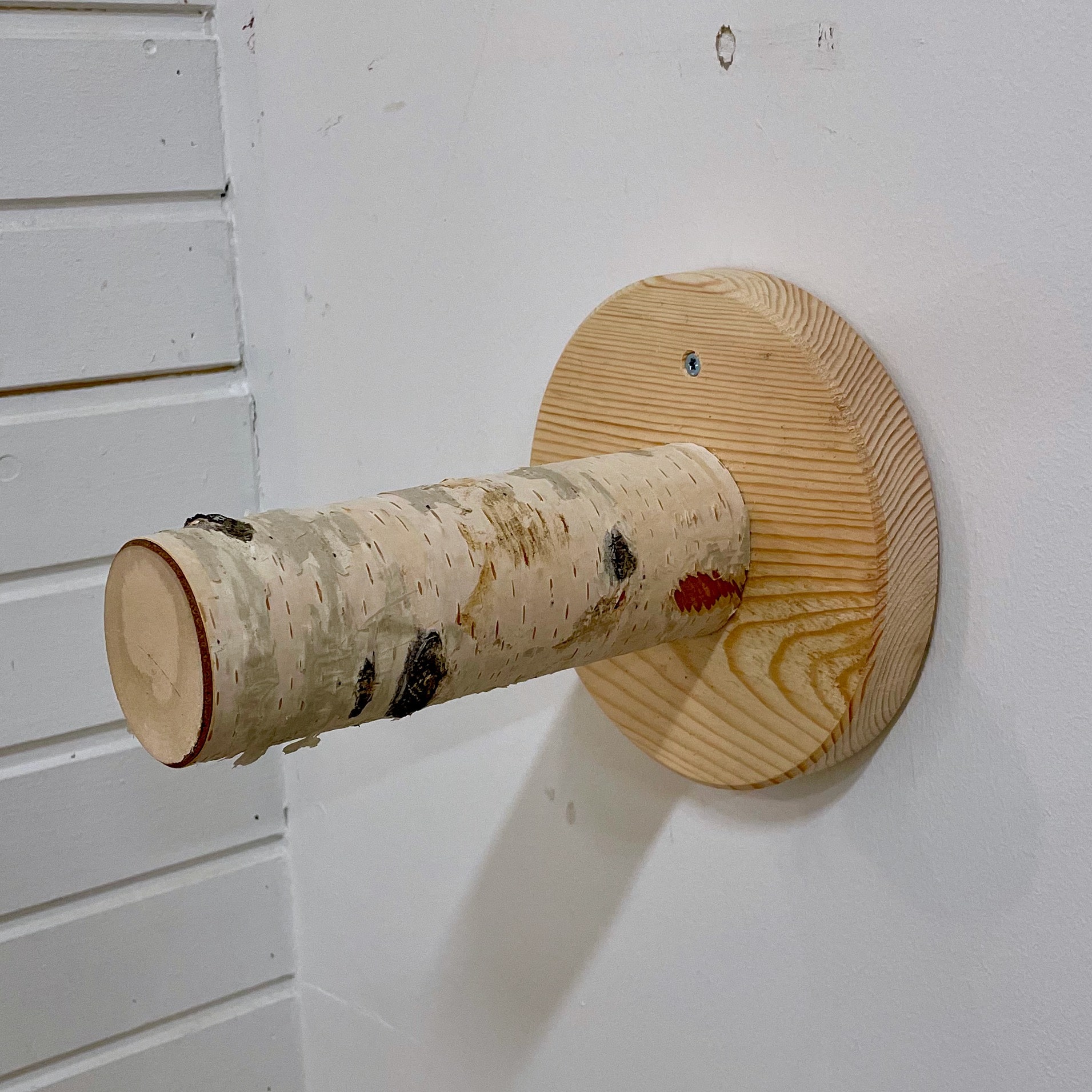 Dit opstapje voor de klimmuur uit de serie Noorse Boskat heeft een rond design met een berkenstam accent. Een compact muurelement dat je kat een opstap biedt om hoger te klimmen langs de muur.