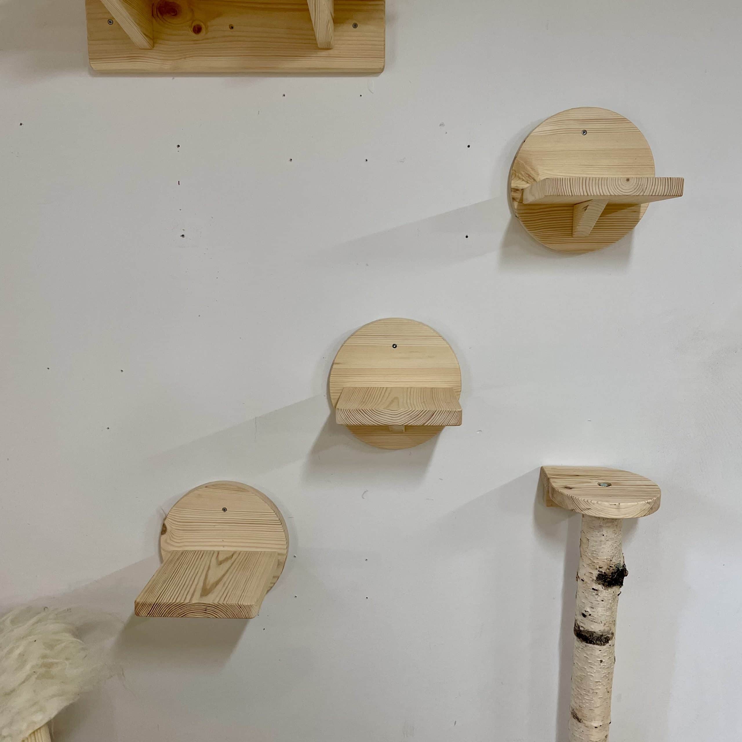 Volledige set van de klimwand model Perzische kat. Deze volledige set bestaat uit een royaal ligplateau, drie opstapjes van berkenhout en een berkenstam die aan de muur gemonteerd kan worden.